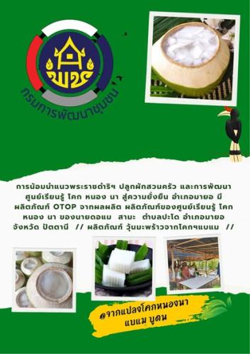 จากผลผลิต ผลิตภัณฑ์ของศูนย์เรียนรู้ โคก หนอง นา ของนายดอแม สามะ ตำบลปะโด อำเภอมายอ จังหวัด ปัตตานี // ผลิตภัณฑ์ วุ้นมะพร้าว, แป้งข้าวมะจานู//